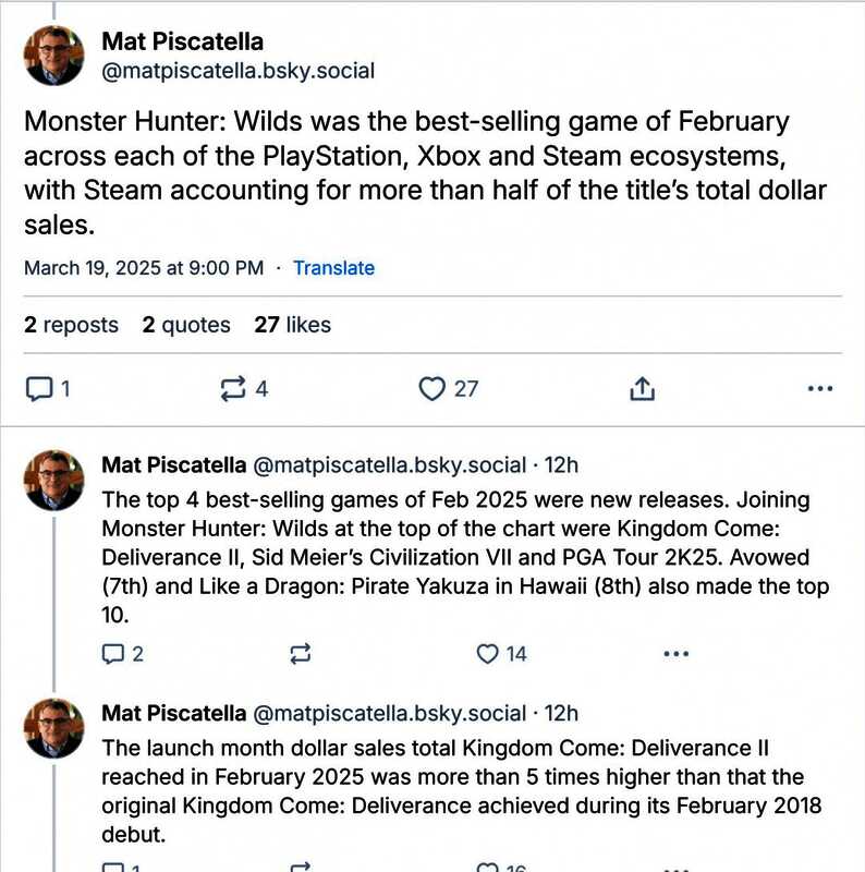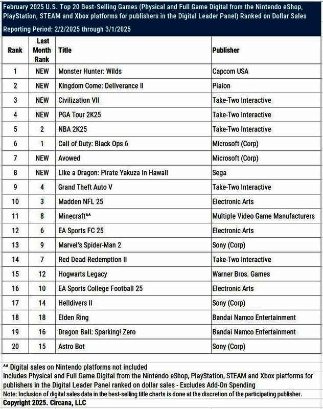 根据统计机构NPD发布的数据,除了《怪物猎人:荒野》外,2月发售的其他两个新作——《天国:拯救》(2.4)和《文明7》(2.11)也都上榜,分列第二和第三名。黑曜石新作《宣誓》排名第七。