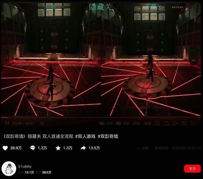 据悉,两名中国玩家全球首通《双影奇境》中的高难隐藏关卡“激光地狱”,并在2025年3月18日凌晨将通关实况发布在了抖音上,不久,他们收到了《双影奇境》工作室参观新游戏开发的邀请。