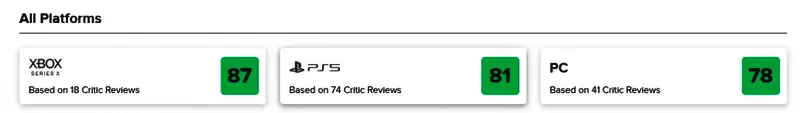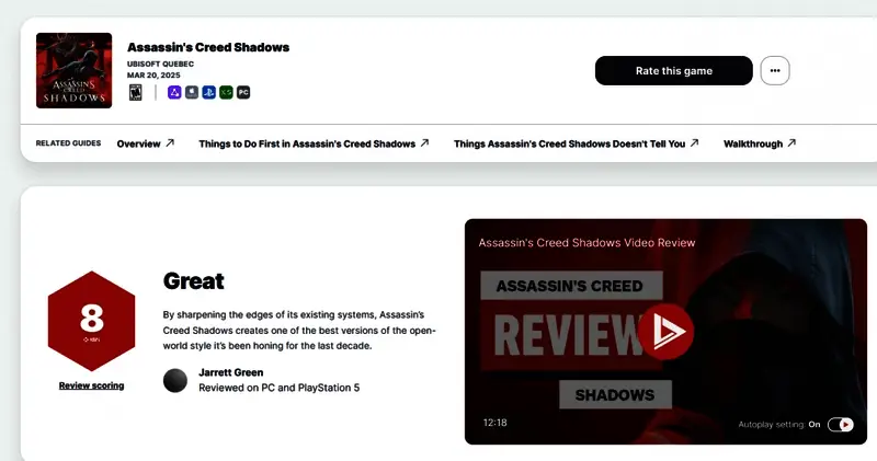 育碧《刺客信条》系列新作《刺客信条:影》M站均分出炉,截止到目前,M站共收录了133篇媒体评测,其中PS5版均分81(74篇)、PC版均分78(41篇)、Xbox Series X|S版均分87(18篇),包括98条好评,27条中评。