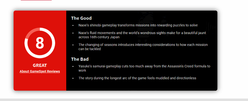 《刺客信条:影》的诸多问题很大程度上源于弥助的加入。这并非因为他是个塑造糟糕的角色,也不是因为他显得格格不入,而是为了让他那武士幻想得以实现,许多《刺客信条》的关键要素都被舍弃了。而奈绪江的忍者幻想则要好得多,她能毫不费力地融入追捕神秘目标、思考最佳接近方式、将其斩杀然后消失得无影无踪的游戏循环之中。他们之间的故事本可以更加统一,尤其是在为这对搭档设定一个共同目标以推动剧情发展和角色成长方面。但至少,奈绪江的游戏体验是该系列自转向更偏向动作角色扮演模式以来最棒的——《刺客信条:影》绝对是一款令人兴奋的游戏。
