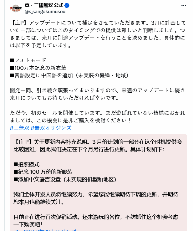 此前,官方还宣布了《真三国无双:起源》的预计更新,包括拍照模式,100 万份的新纪念服装以及添加中文语言设置(未实现的机型和地区)将推迟至下个月发布。