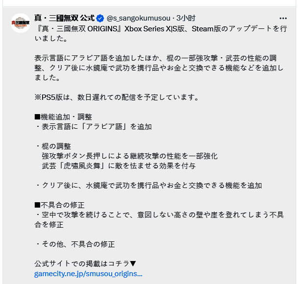 3月19日,《真三国无双:起源》发布更新,新增阿拉伯语、漏洞修复、调整平衡等内容,但是,此次更新PS5版本将推迟几天上线。