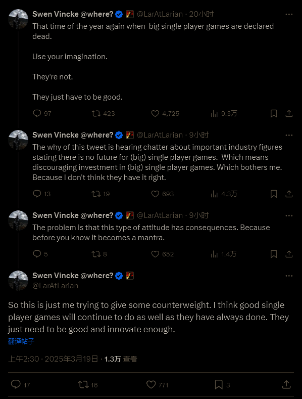 Swen 后续解释道,自己之所以突然发表意见,是因为他听到一些业内重要人物又在宣告大型单人游戏“没有未来”:“这意味着不鼓励对大型单人游戏的投资。这让我很困扰。因为我觉得他们说的不对。”