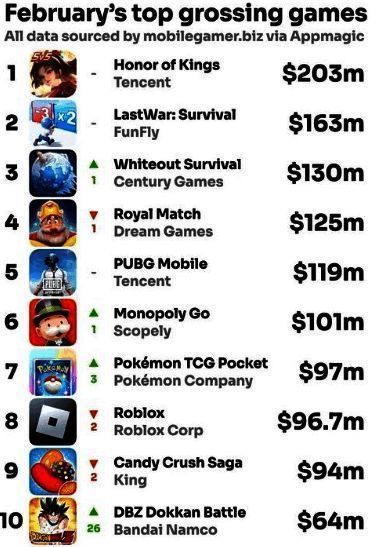 美国数据调查公司Appmagic日前发布了2025年2月的全球手游销售收入最新排行,国产游戏占据前三甲,《宝可梦卡牌P》位于第七名。