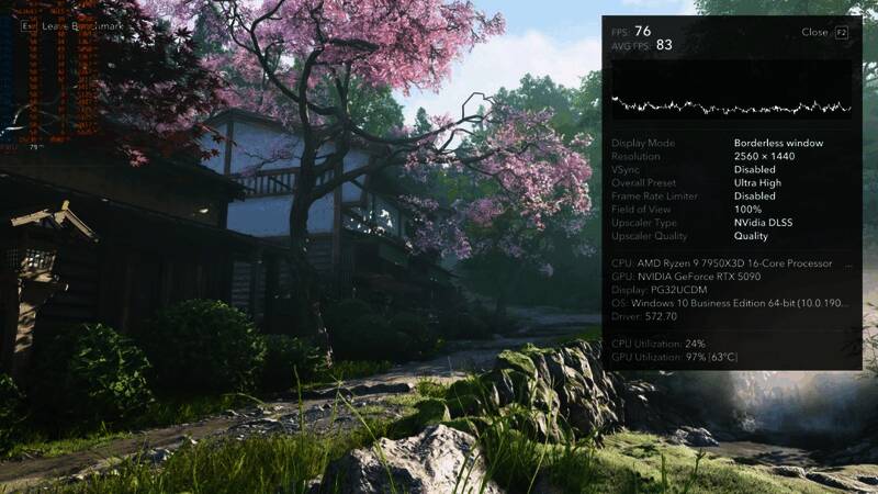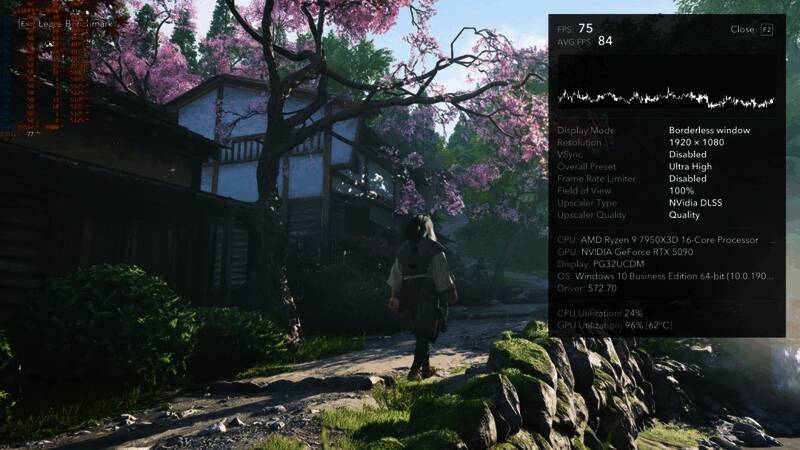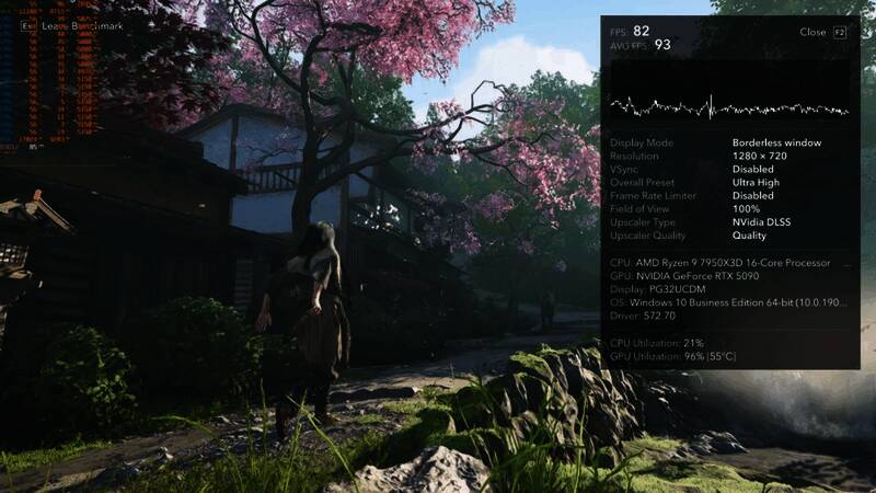 Dsogaming在1080P和1440P下测试《刺客信条:影》RT效果时,发现一些奇怪结果。游戏使用超高画质/最大RT/DLSS4质量模式,在这两种分辨率下的运行效果完全相同。这通常表明CPU存在瓶颈。但AMD Ryzen 9 7950X3D有瓶颈?于是测试人员开始调查。下面是1080P和1440P下的两张基准截图。虽然性能保持不变,但GPU利用率却高达96%。