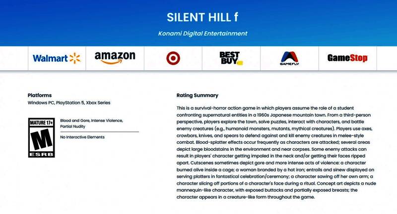 《寂静岭f》完成了ESRB分级(17+),ESRB的评级描述中没有提到任何枪械。只是说玩家可以使用斧头,撬棍、刀和矛来防御,并在近战攻击中杀死敌人。