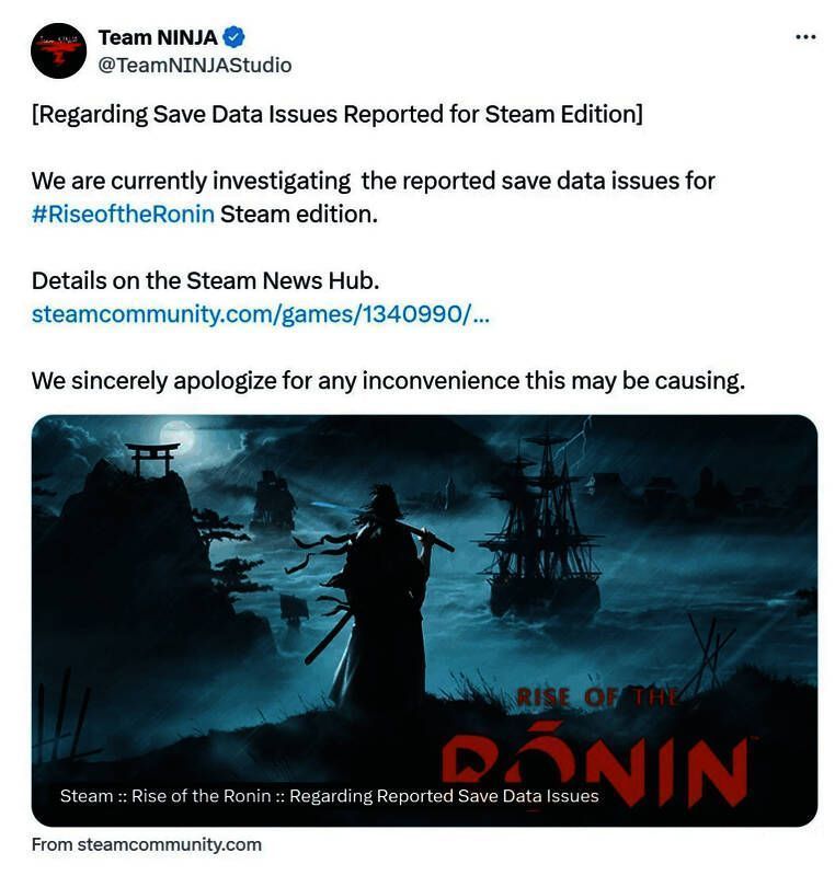 对此,Team Ninja官方X账号发布了消息,称正在调查《浪人崛起》PC Steam版玩家反应的存档问题。该帖子链接到官网支援板块,为玩家提供了解决该问题的潜在方法,包括查找备份保存数据、在保存到Steam Cloud时遵循额外步骤,或关闭Google Drive、OneDrive或Dropbox的文件共享。