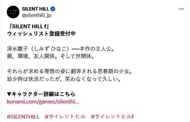 在《寂静岭f》公布后,Konami《寂静岭》官推马不停蹄地启动了宣传工作。今日官推发布了《寂静岭f》女主——高中生深水雏子的形象设计和背景介绍。