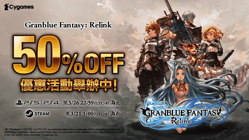 负责游戏企划、开发、营运事业的Cygames, Inc.(以下为Cygames 资讯,总公司位置:东京都涩谷区,常务董事兼执行长:渡边耕一)宣布旗下动作RPG 作品《GranblueFantasy: Relink》,举办Steam®版、PlayStation®5 / PlayStation®4 版的优惠活动。