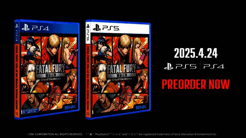 株式会社 SNK宣布,2025年4月24日(周四)发售的新作格斗游戏《饿狼传说:群狼之城》亚洲区实体版(PlayStation®5/PlayStation®4)已正式开放预约(中国大陆地区除外),从今日起可在各大家电量贩店和游戏商店进行预约。