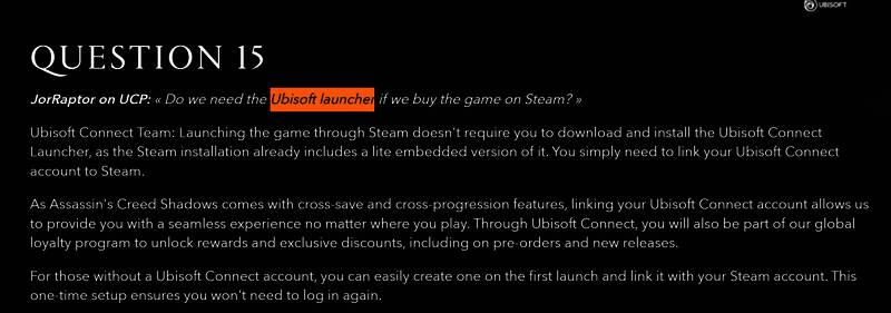 根据育碧今年2月发布的《刺客信条:影》官方FAQ,在第15个问题中,育碧官方确认《刺客信条:影》PC Steam版并不需要下载和安装育碧自家的Connect启动器。