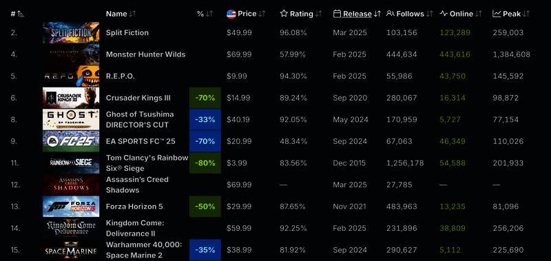 根据SteamDB,过滤掉免费游戏部分,《刺客信条:影》目前排名第8。分析预测,《刺客信条:影》的预购看起来还可以,可能已经超过了30万套。