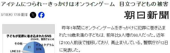 3月13日今天,日本警察厅公布了一则数据,显示去年因网游导致犯罪未满18岁的儿童达到98人,比起前年增加了9人,引发公众热议和担忧。