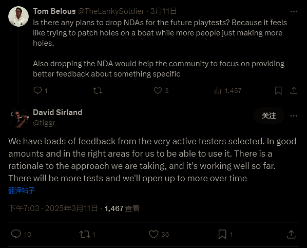 当一位玩家在 Sirland 的社交媒体帖子下表达了对开发者默许测试内容泄露的惊讶后,Sirland写道:“我并不接受泄密,它们也会到相应的处理。”