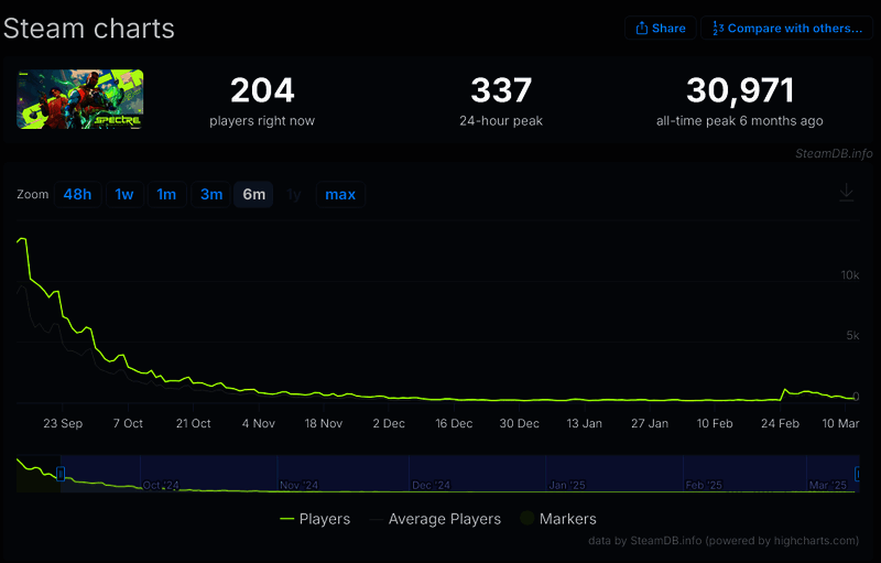 《SpectreDivide》发布首周吸引了约 40 万名玩家,同时在线玩家峰值在 9 月达到了 3 万余人的峰值,但之后迅速下降。游戏内的微交易价格过高给玩家很差的第一印象。此后玩家人数一直下滑,直到 11 月跌至低点后再也未能重获热度。2月新赛季的推出玩家数量也未能达到预期。