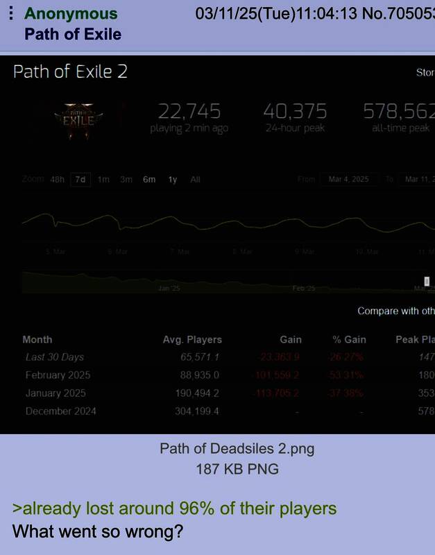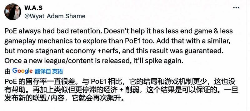 对于这种现象,国外的粉丝似乎并不担心。有许多国外玩家指出,对于PoE这种游戏来说,非常正常。2代本来就有很多跟风的玩家,热度过后,很多玩家才发现可能自己并不适合/喜欢这款游戏。而对于老玩家来说,已经发售三个月后,该打的内容都已经打了,甚至练了好几个其他职业,现在就在等更新。