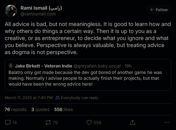 独立开发者 Rami Ismail 则发帖表示,试图去提建议虽然并不好,但也不是毫无意义,其他人可以从中寻求灵感,但将其视为必胜法则绝不是“成功之道”。