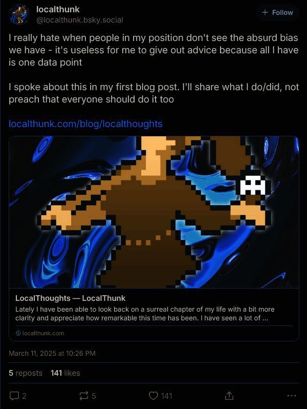 Local Thunk 此时加入了对话,说道:“我真的很讨厌处于我这个位置的人看不到我们存在的荒谬偏见——我给出建议是没用的,因为我只有一个数据点。我在我的第一篇博客文章中谈到了这一点。我会分享我所做/做过的事情,而不是鼓吹每个人都应该这样做。”