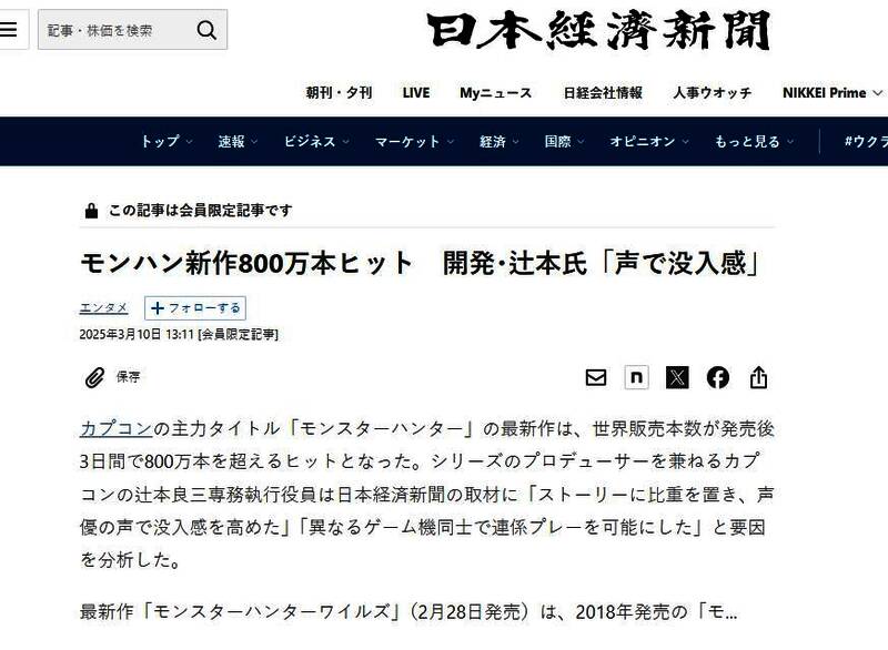 发售3天内销量就突破800万份的《怪物猎人:荒野》,是今年目前为止最热门的游戏之一,其系列制作人辻本良三近日在接受《日本经济新闻》的采访时透露,《怪物猎人:荒野》受欢迎度的提升源于对故事的重视。