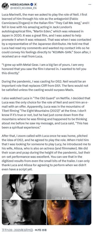 近日,小岛工作室发布了《死亡搁浅2》新预告片,并宣布游戏将于6月26日登陆PS5,其中预告中的新角色“Neil”由于酷似《合金装备》系列的“固蛇”而备受关注,小岛秀夫也在今天的新推文中介绍了“Neil”的演员Luca Marinelli的选角幕后故事。