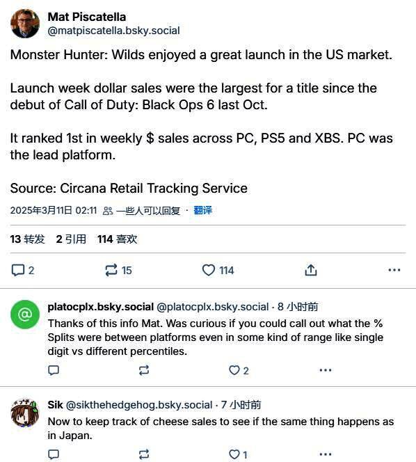 据美国市场分析集团Circana的Mat Piscatella,在社交媒体Bluesky上透露的消息可知“《怪物猎人:荒野》在美国市场上取得了巨大的成功” 。Piscatella还提到:“自去年10月《使命召唤:黑色行动6》首次亮相以来,首发周的美元销售额创下了游戏的最高纪录,该游戏在PC、PS5和Xbox Series主机上的每周美元销售额中名列前茅”。