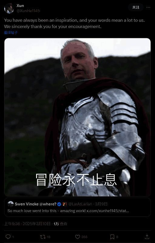 这样的诚意也感动了 Vincke。在社交媒体上,Vincke表达了自己的认可,写道:“它投入了非常多的爱——做的很棒!”
