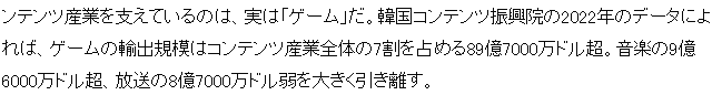 ·根据韩国创作物振兴院的数据统计,2022年的韩国游戏文化输出占比达到了全体的70%,约为89.7亿美元,而音乐领域只有9.6亿美元、影视为8.7亿美元,游戏业占据绝对优势。
