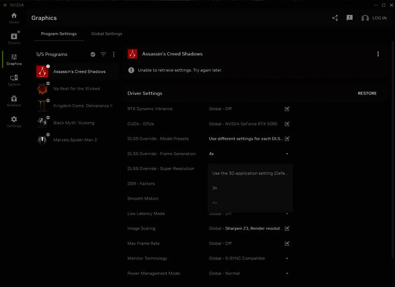 通过英伟达App,可以开启3倍或4倍多帧生成。另外还可以受益于最新的Transfomer模型DLSS 4超级分辨率技术。