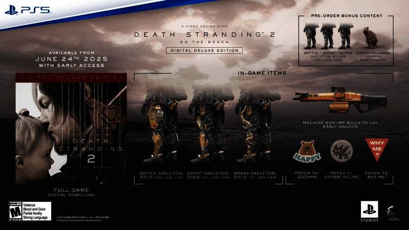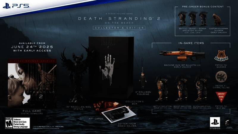 预购“数字豪华版”或“典藏版”的玩家,可以提前2天游玩,即在6月24日即可开始体验。典藏版包含15英寸麦哲伦人雕像、玩偶人雕像、艺术卡、小岛秀夫的一封信和一些游戏内物品,售价229.99美元。标准版售价69.99美元,数字豪华版售价79.99美元。