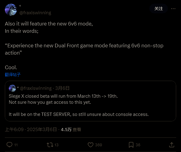 根据消息泄露者 fraxiswinning 在社交媒体上的分享,《围攻X》将采用全新的 6v6 模式。开发者将其描述为“具有 6v6不间断动作的全新双重战线游戏体验”。