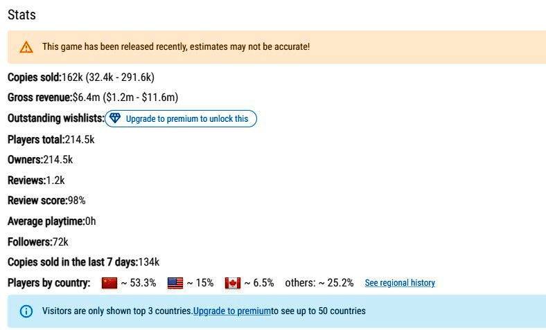 据悉,《双影奇境》中国玩家数占玩家总数53.3%,美国玩家数占比为15%,加拿大玩家数占比为6.5%,其他国家地区的玩家占比为25.2%。此外该网站预估,目前游戏销量可能在16.2万份左右。