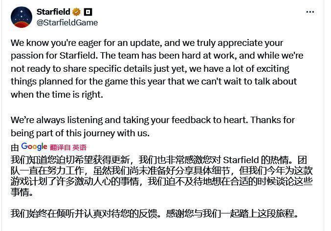 官推写道:“我们知道大家迫切希望获得更新,我们也非常感激大家的热情。《星空》团队一直在努力工作,虽然我们尚未准备好分享具体细节,但我们今年为这款游戏计划了大量令人兴奋的东西,我们迫不及待地想在合适的时候谈论这些事情。 我们一直在倾听并认真对待您的反馈。感谢您与我们一起踏上这段旅程。”