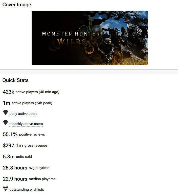 近日据VGInsights数据显示,《怪物猎人:荒野》在Steam上销量已达530万份,游戏收入已超2.97亿美元(约合人民币21.52亿)。玩家在Steam上平均游玩时间为25.8小时。