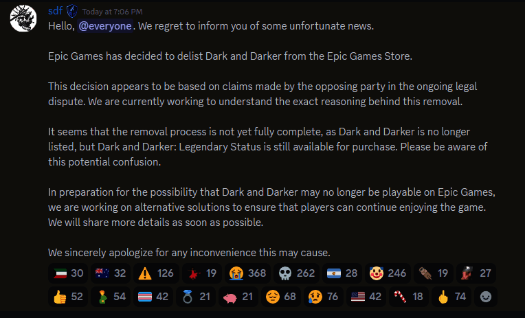 Ironmace通过Discord告知玩家:“Epic已决定将《Dark and Darker》下架”,该决定似乎是基于正在进行的法律纠纷中对立双方提出的主张。