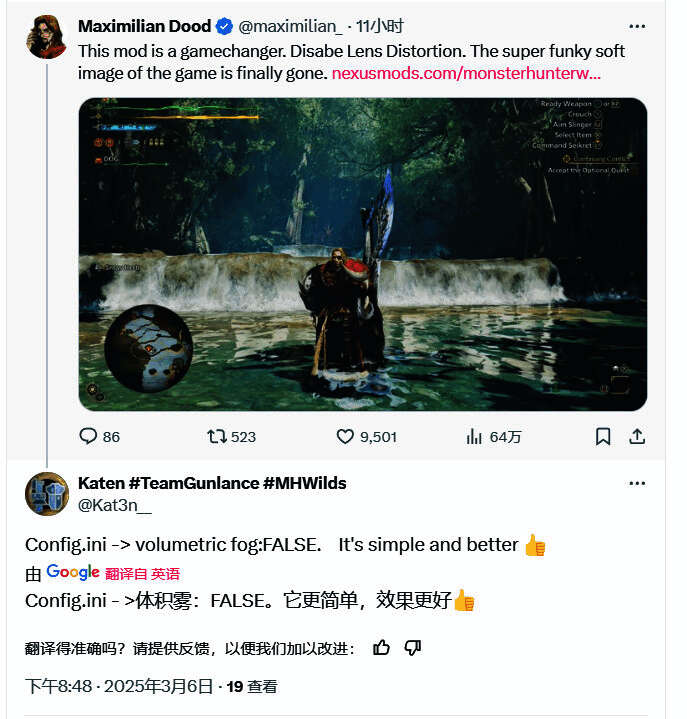 推主@maximilian_分享了一款MOD,可关闭《怪物猎人:荒野》中的镜头失真(Lens Distortion)效果,让游戏画面更清晰。推主表示禁用后“超级怪异的柔和图像终于消失了”,这表明原有的镜头失真效果可能让画面显得模糊或不舒适。