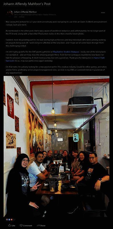此外,索尼马来西亚工作室的前高级项目经理 Johann Affendy Mahfoor 在领英上透露,该工作室也面临裁员。