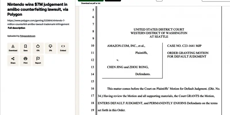 近日,任天堂又赢得一起诉讼,这次是针对在亚马逊上销售假Amiibo卡的卖家。早在2023年10月,任天堂和亚马逊就联合对出售假冒任天堂商品的卖家提起了诉讼,但卖家并未回应。