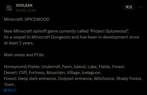 在社交媒体上,消息泄露者 XOX_LEAK 透露,这款热门游戏《我的世界》的 ARPG 衍生作的续作在内部代号为“Spicewood”,并且“已经开发了至少 2年”。