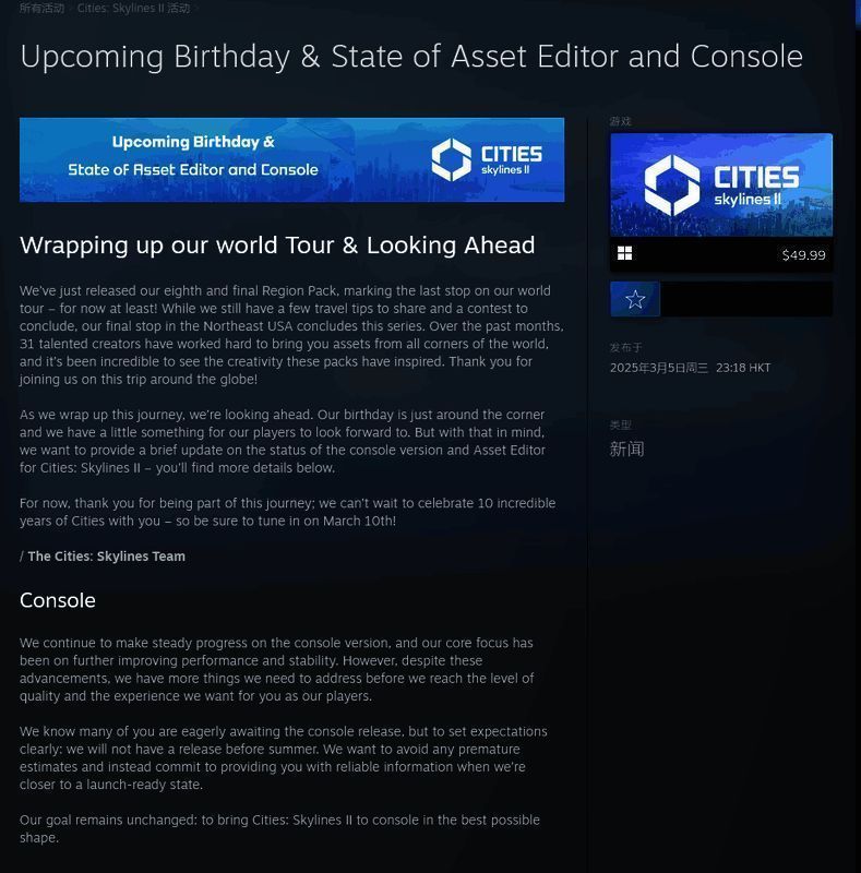 P 社表示,开发商 Colossal Order 的团队正在主机版开发上取得“稳定进展”,并补充称主机版开发的核心重点是性能和稳定性改进。然而“为了让游戏达到我们希望玩家获得的质量和水平”,还有很多事情要做。