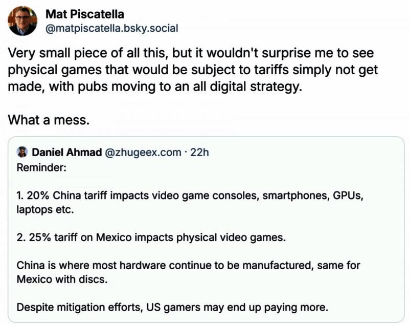 Circana分析师Mat Piscatella在Bluesky上发帖称,从墨西哥进口实体商品的成本增加(北美实体游戏绝大多数光盘都是在墨西哥生产),可能会导致发行商进一步远离实体游戏。
