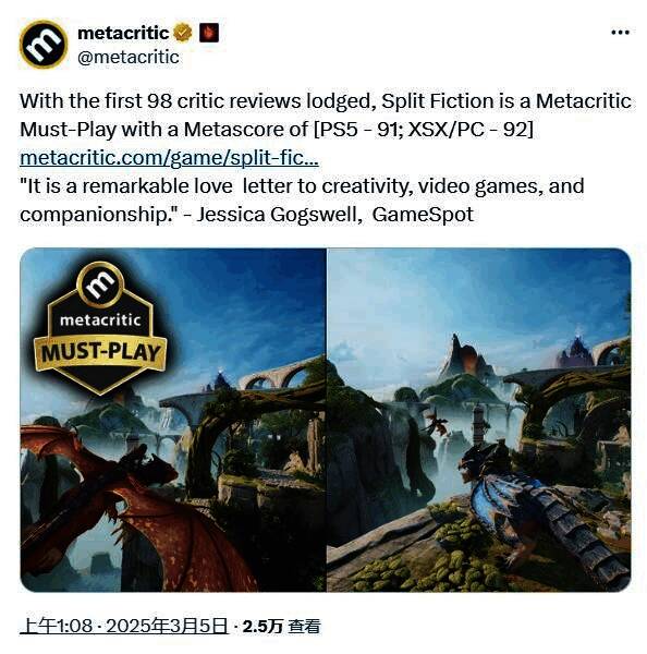 《双人成行》开发商雾影工作室新作《双影奇境》M站均分出炉,截止到目前,M站共收录了118篇媒体评测,其中PS5版均分91(84篇)、PC版均分92(23篇)、Xbox Series X|S版均分92(11篇),超越《怪物猎人:荒野》和《天国:拯救2》,成为了M站2025年均分最高的游戏,同时游戏也获得了M站“Must Play”标签。