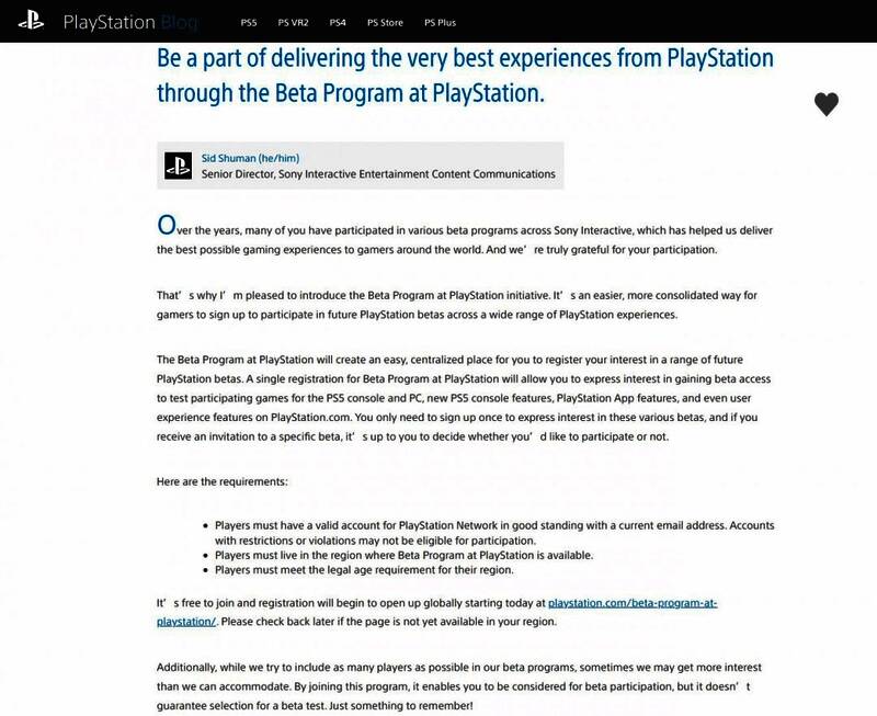 玩家可以通过“PlayStation Beta计划”网站注册,但索尼指出,注册用户需要拥有PlayStation Network帐户,并且必须拥有良好的信誉和可用的电子邮件地址。此外,参与者必须符合所在地区的法定年龄要求,并且只有在该地区有特定Beta测试开启时才能参与。