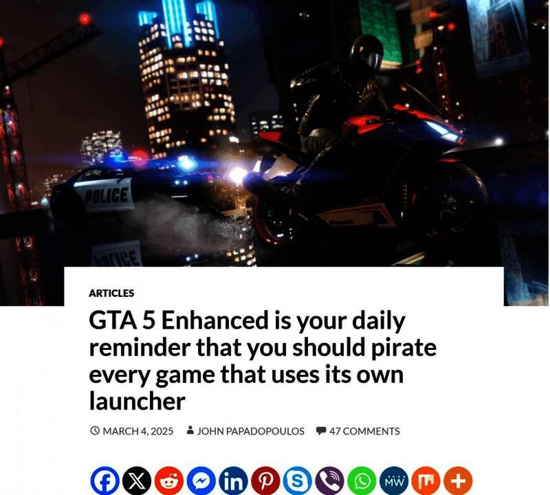 “所以,虽然我想和大家分享一些增强版的PC截图,但我实在做不到。而且,坦白说,我还有其他更重要的事情要做,而不是花一整天时间排除故障。不过,这整件事让我想起了为什么我们大多数人如此反对那些荒谬的游戏启动器。如果客户为了玩自己购买的游戏而不得不求助于盗版,那么你作为一家公司就失败了。但谁在乎呢Take-Two和Rockstar忙于起诉MOD制作者,而不是修复他们的垃圾软件!”