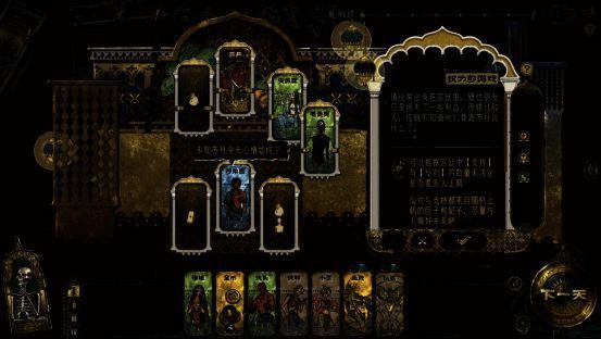横跨市井巷陌、娼馆、苏丹宫殿与宗教圣地,游戏中的每个场景都有着丰富的人和事件等待着你去探索交互。你需要在家人与盟友的辅佐下,收集资金、情报和更多盟友的支持,通过一个又一个的事件抉择,不断地积累实力,不论是成为朝堂上只手遮天的弄臣、还是暗地里谋划弑君、抑或是远走他乡逃离这绝望的游戏。都需要玩家持续不断地做出合适的决策,方有可能达成最终的目标。