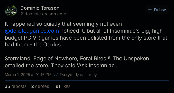 Tarason 还表示,下架应该是在一段时间内发生的,而非同一时间下架的。而且游戏已经彻底无法再获取。他表达了对于这些游戏历史性保护的担忧,写道:“其他游戏已经彻底消失,甚至盗版和种子网站都找不到它们了。考虑到 Insomniac 是一家备受瞩目的 3A 工作室,这有点可怕。”