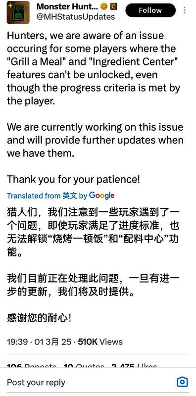 卡普空表示“将于明天早上部署一个修复已知进度障碍的补丁,”。