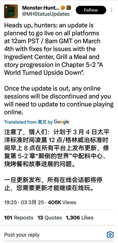 卡普空补充道,更新发布后,任何在线会话都将中断,玩家需要下载更新才能继续在线游玩。