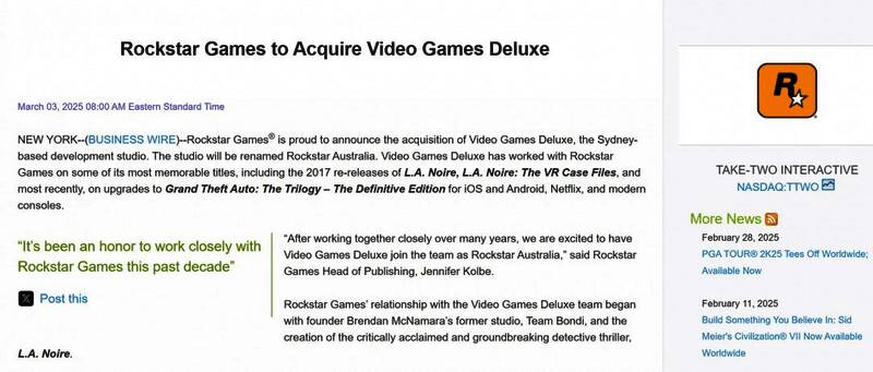 Take-Two也在官方声明中表示:“多年来与Video Games Deluxe密切合作,我们很高兴他们能加入我们的澳大利亚团队。”