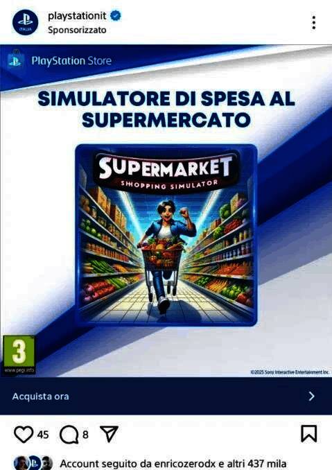 PlayStation意大利官方Instagram页面发布了一则动态,宣传一款名为《超市购物模拟器》的游戏。正如你所见,图片中不管是人物动作还是画风,都不禁让人怀疑这是AI生成的图片。