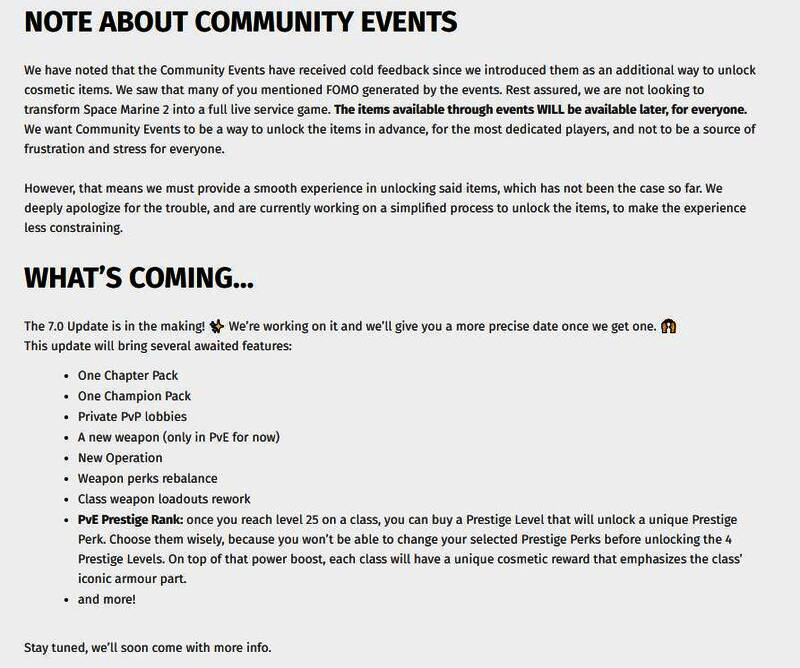 联合声明中提到:“我们看到你们中的许多人提到了活动产生的FOMO(Fear of Missing Out,指一些玩家担心错过限时提供的装饰物品)。请放心,我们并不想将《战锤40K:星际战士2》变成一款完整的实时服务游戏,通过活动获得的物品将在之后提供给所有玩家。”